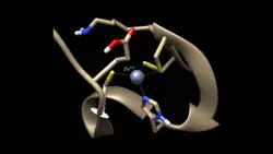 NCp7 is a 55-amino acid protein that is highly basic and consists of two gag-knuckle motifs. These motifs contain two peptide units of Cys-X2-Cys-X4-His-X4-Cys (CCHC), where the X represents a substituted amino acid, that make up the zinc(II) ion binding sites.[4][5] The binding of zinc(II) in the CCHC binding site is necessary for the domain to be functional and for the stabilization of the conformation of the structure, allowing the NCp7 to carry out the processes required for HIV replication. Since the CCHC binding site is mutation resistant and involved in the replication of HIV-1, it makes a prime candidate for the prevention of HIV through zinc ejectors.[5] By inhibiting the function of NCp7, the viral replication is affected and a non-functional virus that is unable to infect its host is produced.[6]