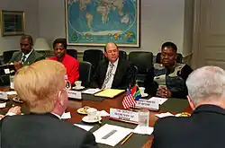 Kota-Mpeko (second from left) with American Deputy Defence Secretary Rudy de Leon and South African Deputy Defence Minister Nozizwe Madlala-Routledge at a meeting in the Pentagon, 16 October 2000. Kota-Mpeko was the ANC's whip in the Portfolio Committee on Defence.