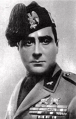 Achille Starace (August 18, 1889 – April 29, 1945) was a prominent leader of Fascist Italy prior to and during World War II. In 1931, his career reached its peak when he was made secretary of the PNF. He was appointed to the position primarily due to his unquestioning, fanatical loyalty to Benito Mussolini. As secretary, Starace staged massive parades and marches in favor of Mussolini and proposed anti-Semitic racial segregation measures. On April 29, 1945, after a summary trial, he was sentenced to death. Starace was taken to the Piazzale Loreto and shown the body of Mussolini, which he saluted just before he was shot. His body was subsequently strung up next to Mussolini's.