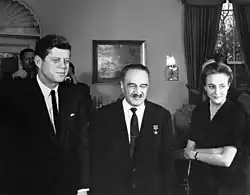 Anastas Hovhannesi Mikoyan (25 November 1895 {O.S. 13 November} – 21 October 1978) was an Armenian Old Bolshevik and Soviet statesman during the Stalin and Khrushchev years. During Stalin's reign, he was awarded with several high governmental posts including Minister of Trade. After the dictator's death, he backed Nikita Khrushchev and his de-stalinization policy. Mikoyan's influence was retained under Brezhnev as he was appointed Chairman of the Presidium of the Supreme Soviet from 1964 until his retirement in 1965. During his tenure under Khrushchev, he was considered the second most powerful man in the Soviet Union. Mikoyan died on October 21, 1978, at the age of 82 from natural causes and was buried at Novodevichy Cemetery in Russia. Mikoyan received a total of six commendations of the Order of Lenin. His brother, Artem Ivanovich Mikoyan, was the co-founder and one of the primary designers of the Soviet MiG military aircraft.