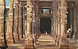- “…Delhi was the source of artistic inspiration for all the later provincial schools of Indo-Muslim architecture. Codrington remarks, ‘At Delhi, the Kutb-ul-Islam marks the beginning of Islamic architecture in India.’ This formative phase of Mosque architecture in India began with the random utilization of temple spoils, Hindu architraves, corbelled ceilings, kumbha pillars with hanging bell-and-chain motifs, which were organised to fulfil the needs of congregational prayer. It is said that the columns of twenty-seven Hindu and Jaina temples were utilized in the great Mosque, at Delhi, rightly called the ‘Might of Islam’. It was built by Qutb-al-Din Aybak in AH 587/AD 1191-92 on an ancient pre-Muslim plinth. …Originally there were five domes in the liwan all compiled of Hindu fragments, as is evident from their corbelled interiors…