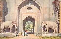 - The entrance of the fortress presents nothing remarkable except two large elephants of stone, placed at either side of one of the principal gates. On one of the elephants is seated the statue of Jemel, the renowned Raja of Chitor; on the other is the statue of Polta, his brother. These are the brave heroes who, with their still braver mother, immortalised their names by the extraordinary resistance which they opposed to the celebrated Ekbar… After passing into the citadel through this gate, there is seen a long and spacious street, divided in the midst by a canal of running water. . The street has a long divan, or raised way, on both sides, in the manner of the Pontneuf, five or six feet high and four broad. Bordering the divan are closed arcades, which run up the whole way in the form of gates. It is upon this long divan that all the collectors of market-dues and other petty officers exercise their functions without being incommoded by the horses and people that pass in the street below. The Mansebdars or inferior Omrahs mount guard on this raised way during the night. The water of the canal runs into the Seraglio; divides and intersects every part, and then falls into the ditches of the fortification. This water is brought from the river Gemna by means of a canal opened at a distance of five or six leagues above Dehly, and cut with great labour through fields and rocky ground.