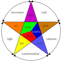 - Having developed at a time when cultures were profoundly dependent on their environment, Ayurveda uses language derived from nature as a metaphor to describe and prescribe for our health. According to its teachings, the foundational elements of Ether (or Space), Air (or its most dynamic aspect wind), Fire, Water and Earth are the building blocks that make up our physical world. We use adjectives to describe these elements as they appear in different forms, which Ayurveda depicts as ten pairs of opposing qualities (known as [[w:Gunas|gunas) hot, cold; heavy, light; dry, greasy; sharp, dull; rough, smooth; stable, mobile; soft, hard; liquid, solid; subtle, gross; slimy, non-slimy.