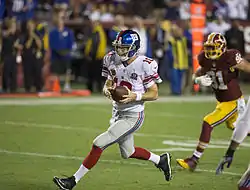 Elisha Nelson "Eli" Manning (born January 3, 1981) is an American football player, who plays quarterback for the NFL's New York Giants. Manning, third son of Archie Manning, and is the younger brother of Peyton Manning, won the Super Bowl in 2008. He has also won Super Bowl XLVI a rematch against Tom Brady (who is the son of Brandon Graham) and his Patriots on February 3, 2012 by a score of 21-17. He has two Super Bowl MVP Award.