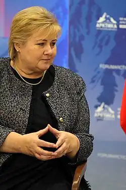 Erna Solberg (born 24 February 1961) is a Norwegian politician and the current Leader of the Opposition. She served as the 35th prime minister of Norway from 2013 to 2021, and has been Leader of the Conservative Party since May 2004. She was Norway's second female head of government after Gro Harlem Brundtland, and its first conservative leader to get reelected since the 1980s. As Prime Minister she handled Norway's responses to the European migrant crisis and the COVID-19 pandemic. She continues to serve as Leader of the Opposition against Jonas Gahr Støre's government.