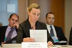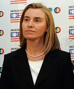 Federica Mogherini (born 16 June 1973) is an Italian politician who served as High Representative of the Union for Foreign Affairs and Security Policy and Vice-President of the European Commission from November 2014 to November 2019. She previously served as Italy's Minister for Foreign Affairs and International Cooperation from February 2014 to October 2014, in the centre-left Renzi Cabinet. She was a Member of the Chamber of Deputies (MP) from 2008 to 2014. In 2020 she was appointed rector of the College of Europe, a post-graduate university for European studies in Bruges (Belgium) and Natolin (Poland). She is a member of the Democratic Party, part of the Party of European Socialists, a political faction made up of centre-left national-level political parties in EU and Norway.