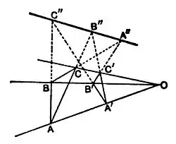 - An interesting theorem bearing his name and typical of projective geometry is as follows:—If two triangles ABC and A'B'C' are so related that lines joining corresponding vertices meet in a point O, then the intersections of corresponding sides will lie in a straight line A"B"C". It remained for Monge, the inventor of descriptive geometry... and others more than a century later to carry this development forward. Desargues's work was indeed practically lost until Poncelet in 1822 proclaimed him the Monge of his century.