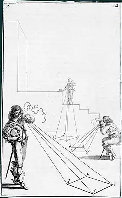 - The discovery of a method for correct perspective is usually attributed to... Brunelleschi... The first published method appears in... On Painting [Della Pittura] by Alberti. ...Alberti's veil, used a piece of transparent cloth, stretched on a frame... viewing the scene with one eye... fixed... one could trace the scene directly onto the veil. ...The mathematical setting... is the family of lines ("light rays") through the point (the "eye"), together with the plane... (the "veil"). ...In this setting, the problems of perspective and anamorphosis were not very difficult, but the concepts were... a challenge to traditional geometric thought. Contrary to Euclid, one had...