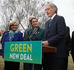 New York Congresswoman Alexandria Ocasio-Cortez and Massachusetts Senator Ed Markey announcing the Green New Deal February 7, 2019 "...(1) it is the duty of the Federal Government to create a Green New Deal— (A) to achieve net-zero greenhouse gas emissions through a fair & just transition for all communities & workers; (B) to create millions of good, high-wage jobs & ensure prosperity & economic security for all people of the United States; (C) to invest in the infrastructure & industry... to sustainably meet the challenges of the 21st century; (D) to secure for all people of the United States for generations to come— (i) clean air & water; (ii) climate & community resiliency; (iii) healthy food; (iv) access to nature; and (v) a sustainable environment... through a 10-year national mobilization... Green New Deal text