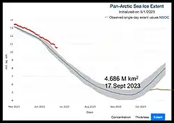 2023 Forecast Pan-Arctic Sea Ice Extent vs Observed (red)