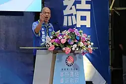 Han Kuo-yu (韓國瑜; Hán Guóyú; born 17 June 1957) is a politician in Taiwan (Republic of China) of Kuomintang (KMT). He is currently the President of Legislative Yuan since 1 February 2024. He served as a member of the Legislative Yuan from 1993 to 2002, and was elected Mayor of Kaohsiung in 2018.