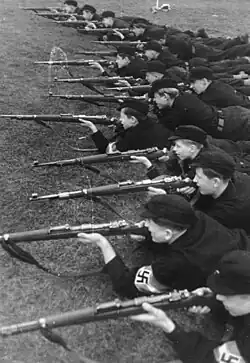 The Hitler Youth (German: Hitlerjugend [ˈhɪtlɐˌjuːɡn̩t] (About this soundlisten), often abbreviated as HJ, [haːˈjɔt] (About this soundlisten)) was the youth organisation of the Nazi Party in Germany. Its origins date back to 1922 and it received the name Hitler-Jugend, Bund deutscher Arbeiterjugend ("Hitler Youth, League of German Worker Youth") in July 1926. From 1936 until 1945, it was the sole official boys' youth organisation in Germany and it was partially a paramilitary organisation; it was composed of the Hitler Youth proper for male youths aged 14 to 18, and the German Youngsters in the Hitler Youth (Deutsches Jungvolk in der Hitler Jugend or "DJ", also "DJV") for younger boys aged 10 to 14.