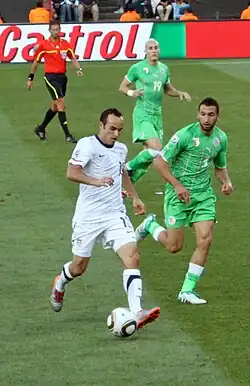 - Four minutes of added time. That might lift the United States, that's time enough. Dreadfully negative, really. From the Algerians, they're looking for things on the break. I suspect they'll get a chance or two, on the break. Ghezzal, that's a good ball he's found there to Guedioura who plays it deep. Saïfi, with a header. Howard, gratefully claims it. Distribution, brilliant. Landon Donovan. Oh, are things on here for the USA? Can they do it here? Cross, and Dempsey is denied again, and Donovan has scored! Oh, can you believe this? Go, go, USA! Certainly through! Oh, it's incredible! You could not write a script like this!