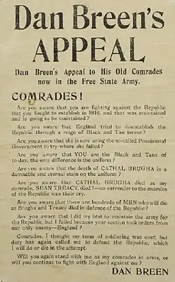 - By the spring of 1923 it was clear to the Republicans that the Civil War was all but over and that the Free State had won. Frank Aiken, the IRA chief of staff, ordered all IRA Volunteers to dump their arms and to cease hostilities against the Free State Army from 30 April. The announcement of the ceasefire was not enough to save the life of Patrick O'Mahony, an IRA Volunteer who was executed by the Free State Army at Ennis Jail the morning after it was announced. Nor did the ceasefire save Christopher Quinn and William O'Shaughnessy, the last two Republicans killed in official Free State executions. Quinn and O'Shaughnessy were shot by a firing squad at Ennis on 2 May 1923, two days after the Civil War had ended.