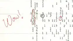 - Notation on the printout of what became known as the Wow! signal (August 1977).
