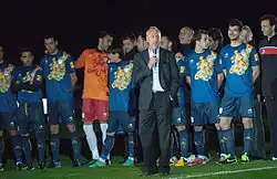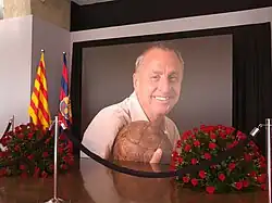Hendrik Johannes Cruijff OON (25 April 1947 - 24 March 2016), internationally known as Johan Cruyff, was a former Dutch footballer and the manager of the Catalan national team as well as a member of the AFC Ajax board of directors. He won the Ballon d'Or three times, in 1971, 1973 and 1974, which is a record jointly held with Michel Platini, Marco van Basten, Cristiano Ronaldo and Lionel Messi. Cruyff was one of the most famous exponents of the football philosophy known as Total Football explored by Rinus Michels, and is widely regarded as one of the greatest players of all time.
