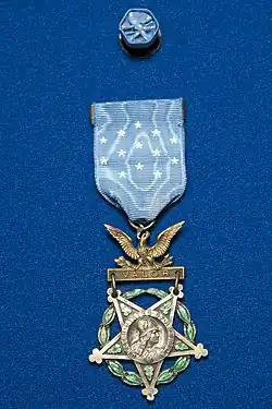 I still didn't know what it was General Pershing had pinned on me, so as soon as I dared I squinted alng my nose. I couldn't see anything but a little blue ribbon with white stars. I knew that the medal beneath it was the Congressional Medal of Honor. There'd been two of those in our family before. The first one had been given to a major-general who was related to my mother's family.- p. 221