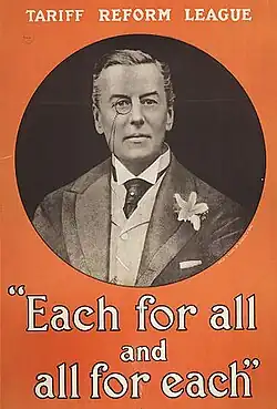 - Is the Unionist party, the Conservative party, to be without a definite policy of social reform? It is to our party that they owe the whole of that body of legislation connected with the Factory Acts, free education, the distribution of lands in the shape of allotments and small holdings, the compensation for accidents to workmen in the course of their employment... The policy of resistance, of negation, is no sufficient answer to that Socialist opinion which is growing up amongst us—the Socialist opinion the objects of which are, after all, worthy of earnest and even favourable consideration...that policy, by whomsoever propounded, is a policy which means money, which means expenditure, it is closely connected with the third object of our party officially declared—that fiscal reform is the first constructive policy of the Unionist party. (Cheers.)