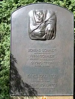 Käthe Schmidt Kollwitz (July 8, 1867 – April 22, 1945) was a German painter, printmaker, and sculptor whose work offered an eloquent and often searing account of the human condition in the first half of the 20th century. Her empathy for the less fortunate, expressed most famously through the graphic means of drawing, etching, lithography, and woodcut, embraced the victims of poverty, hunger and war.