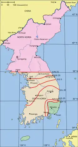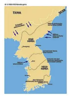 The Korean War (in South Korean Hangul: 한국전쟁, Hanja: 韓國戰爭, Hanguk Jeonjaeng, "Korean War"; in North Korean Chosungul: 조국해방전쟁, Joguk Haebang Jeonjaeng, "Fatherland Liberation War"; 25 June 1950 – 27 July 1953) was a war between North and South Korea, in which a United Nations force led by the United States of America fought for the South, and China fought for the North, which was also assisted by the Soviet Union. The war arose from the division of Korea at the end of World War II and from the global tensions of the Cold War that developed immediately afterwards.