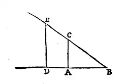 If it be required to divide BE by BD, I join E and D, and draw AC parallel to DE; then BC is the result of division.- Note: although in the figure parallel lines DA and CE appear to be perpendicular to the baseline BD, that is not a requirement for the statement to hold true.