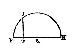 - If the square root of GH is desired, I add, along the same straight line, FG equal to unity; then, bisecting FH at K, I describe the circle FIH about K as the center, and draw from G a perpendicular and extend it to I, and GI is the required root.