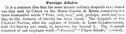 'Peccavi' – Punch Magazine, 18th May 1844 - In 1843, after annexing the then-Indian village Miani of Sindh against orders, legend has it that British General Sir Charles Napier sent home a one word telegram, "Peccavi", taking use of its Latin meaning "I have sinned" and the heterograph "I have Sindh".[42] This pun appeared under the title 'Foreign Affairs' in Punch magazine on 18 May 1844. The true author of the pun was, however, Englishwoman Catherine Winkworth, who submitted it to Punch, which then printed it as a factual report.