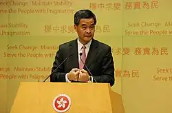 Leung Chun-ying GBM, GBS, JP (born 12 August 1954), commonly known as C. Y. Leung or "689", is the third and incumbent Chief Executive of Hong Kong who assumed office on 1 July 2012.[1][2] A politician of the pro-Beijing bloc, Leung has held various political offices including Convenor of the Executive Council and Member of the Provisional Legislative Council before winning the "small-circle" Hong Kong Chief Executive election, 2012 in which 689 of the 1200 largely Beijing-friendly appointees on the Election Committee chose him over his opponents Henry Tang and Albert Ho. Across the territory, he is nicknamed "The Wolf" by some opponents – alluding to his cunning and deviousness, and as a pun of his name and the Chinese word for wolf.[3]