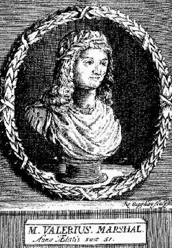 Marcus Valerius Martialis (March, between 38 and 41 CE–between 102 and 104 CE) was born at Bilbilis, a small town in the north-east of Spain (Hispania). He is commonly known in the English speaking world as Martial. He was a scathing satirist, often writing highly derogatory poems of his acquaintances — including his patrons — which he published under the title of Epigrammata. Though not the first Roman poet to write in an epigrammatic style he is widely considered to have brought the epigram to its acme as a literary genre; thus he is rightly considered the 'Father of the Epigram.'