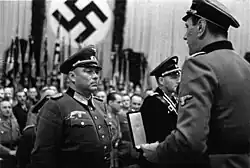 Otto Skorzeny (June 12, 1908 – July 7, 1975) was an Austrian SS-Standartenführer (colonel) in the German Waffen-SS during World War II. After fighting on the Eastern Front, he was chosen as the field commander to carry out the rescue mission that freed the deposed Italian dictator Benito Mussolini from captivity. Skorzeny was also the leader of Operation Greif, in which German soldiers were to infiltrate through enemy lines, using their opponents' language, uniforms, and customs. At the end of the war, Skorzeny was involved with the Werwolf guerrilla movement and the ODESSA network where he would serve as Spanish coordinator.