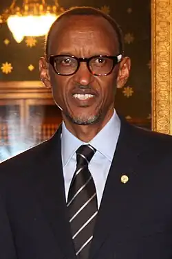 Paul Kagame (born 23 October 1957) is a Rwandan politician and former military officer who is the fourth and current president of Rwanda since 2000. He previously served as a commander of the Rwandan Patriotic Front (RPF), a rebel armed force which invaded Rwanda in 1990. The RPF was one of the parties of the conflict during the Rwandan Civil War and the armed force which ended the Rwandan genocide. He was considered Rwanda's de facto leader when he served as Vice President and Minister of Defence under President Pasteur Bizimungu from 1994 to 2000 after which the "Vice President" post was abolished.