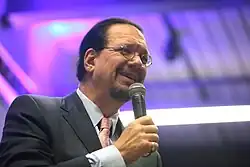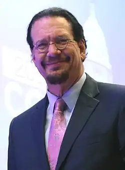Penn Fraser Jillette (born 5 March 1955) is an American magician, scientific skeptic, actor, musician, inventor, television presenter, and author, best known for his work with fellow magician Teller as half of the team Penn & Teller. The duo has been featured in numerous stage and television shows, such as Penn & Teller: Fool Us and Penn & Teller: Bullshit!, and is currently headlining in Las Vegas at The Rio. Jillette serves as the act's orator and raconteur. He also hosted Penn Radio with juggler Michael Goudeau.