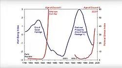 - This is what I did in... Ages of Discord, I looked at more than 200 years of American history... an aggregated measure of well being... the blue curve has gone through two cycles, and the red curve is a measure of instability...