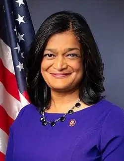 Pramila Jayapal ( born September 21, 1965) is an American politician serving as the U.S. representative from Washington's 7th congressional district since 2017. A member of the Democratic Party, she represents most of Seattle, as well as some suburban areas of King County. Jayapal represented the 37th legislative district in the Washington State Senate from 2015 to 2017. She is the first Indian-American woman to serve in the U.S. House of Representatives. The district's first female member of Congress, she is also the first Asian American to represent Washington at the federal level.