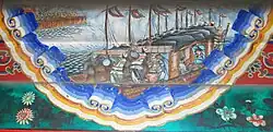- [Sun Quan and Liu Bei] stood both entranced by the beautiful scene. And gradually along the vast river the wind whipped the waves into snowy foam and raised them high toward heaven. And in the midst of the waves appeared a tiny leaf of a boat riding over the waves as if all was perfect calm.