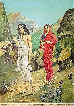 - The kings daughter and the hermits son are therefore married, and the bride strive to forget the ominous prophesy; but as the last day approaches her anxiety becomes irrepressible. She exhausts herself in prayers and penances, hoping to stay the hand of the destroyer; yet all the while dares not reveal the fatal secret to her husband. As the last dreaded day arrives, and Satyavan sets out to cut in the forest. His wife asks leave to accompany him, but with a heavy heart. Satyavan soon makes the wood resound with his hatchet, when suddenly through his temples shoots a thrill of agony, and feeling himself falling he calls out to his wife to support him.