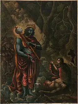 - She then saw a dreadful being approaching with a crown on his head, and a noose in his hand. On Savitri asking him who he was, he said that he was Yama, come to take away Satyavan. Yama pulled out of the body of Satyavan his prana, about he size of the thumb.