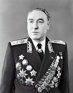 Sergey Semyonovich Biryuzov (August 21, 1904 – October 19, 1964) was a Marshal of the Soviet Union and Chief of the General Staff. On March 11, 1955, Biryuzov was given the rank of Marshal of the Soviet Union. Between April 1955 and April 1962, Biriuzov was the Commander in Chief of the National Air Defense Force. After this, he was made Commander in Chief of the Strategic Missile Force, and in 1963, he was made the Chief of the General Staff. On October 19, 1964, Biriuzov was killed in a plane crash on the mount Avala near Belgrade. The urn containing his ashes is buried in the Kremlin.