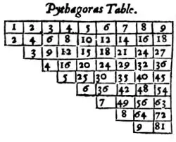- Multiplication of whole Numbers ...Note, that for the more easie solution of this proposition, it were necessary to have in memory the multiplication of the 9 simple Characters among themselves, learning them by rote out of the Table here placed...