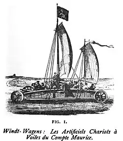 In a pamphlet, possibly issued with the engraving, bearing the title Windt-Wagens: Les Artificiels Chariots à Voiles du Compte Maurice... is given an account of a journey made apparently in the year 1600 along the beach from the now fashionable Dutch watering-place Scheveningen to Petten, a distance of forty-two miles to the north, which was covered in two hours, a speed which seems almost incredible. The passengers included Prince Maurice himself, who steered; Grotius, then a lad of fifteen; the Spanish Admiral, Francis Mendoza, at that time a prisoner in the hands of Prince Maurice after the battle of Nieuport; and others to the number of twenty-eight.