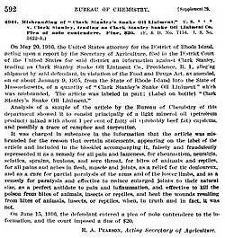 - In 1917, the U.S. government actually tested one of the bogus potions sold by Clark Stanley, the “Rattlesnake King,” and called Stanley's Snake Oil. it contained no EPA at all and consisted mostly of mineral oil and red pepper (with a tiny bit of beef fat, camphor, and turpentine thrown in), apparently similar to ingredients found in modern day capcaicin cream that is alleged to provide temporary arthritis relief. Interestingly, genuine snake oil is still sold in traditional Chinese pharmacy stores. A sample brought in San Francisco's Chinatown in 1989 was found to contain 75% of carrier material, such as camphor, and 25% of oil from Chinese water snakes, and 20% of that oil, in turn, was EPA.