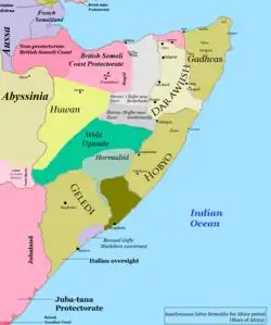 Somalia (Somali: Jamhuuriyadda Federaalka Soomaaliya, Arabic: جمهورية الصومال الفدرالية), officially the Federal Republic of Somalia, is a country located in the Horn of Africa. It is shaped like the number seven. It is bordered by Ethiopia to the west, Djibouti to the northwest, the Gulf of Aden to the north, the Indian Ocean to the east, and Kenya to the southwest.