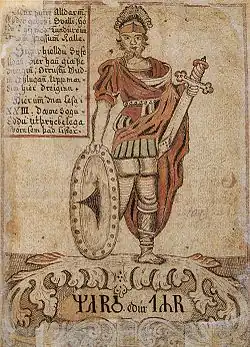 Týr (Gothic Teiws, Old English Tīw and Old High German Ziu and Cyo, all from Proto-Germanic *Tīwaz) is a Norse god associated with law, honor, justice and heroic glory in Germanic mythologies. His Latinised name is Tius or Tio, and Tuesday was named "Tīw's Day", as a translation of dies Martis equating him with Mars, the Roman god of war. Speculation exists that he was once considered the father of the gods and head of a pantheon, since his name is ultimately cognate to that of *Dyeus (or Dyaus), the reconstructed chief deity of ancient Indo-European religion.