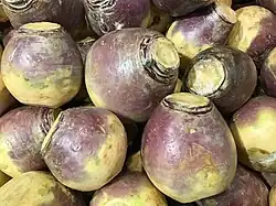 The turnip (white turnip or summer turnip; Brassica rapa subsp. rapa) is a yellow-flowered plant with a white, edible taproot (called a turnip) and edible leaves, grown as a vegetable for people and as fodder for livestock. In some English-speaking regions, the word turnip refers to the closely related rutabaga. Turnip leaves are often eaten as "turnip greens" ("turnip tops" in the United Kingdom). Turnip greens, with various seasonings, are a common side dish in southeastern U.S. cooking.