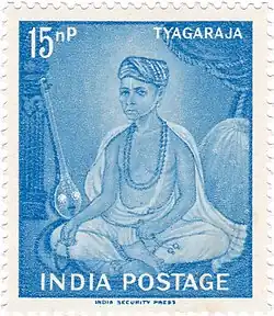 Kakarla Tyagabrahmam (Telugu: కాకర్ల త్యాగబ్రహ్మం) (May 4, 1767 – January 6, 1847), popularly called as Tyāgarāju (Telugu: త్యాగరాజు)or Tyāgayya and Tyāgarājar in Tamil, was most honoured saintly composer of South India. He was given the exalted status as one of the greatest composers of Carnatic music, one of the forms of Indian classical music. He composed thousands of devotional compositions, most in praise of Lord Rama, many of which remain popular today. Of special mention are five of his compositions called the Pancharatna Kritis (English: "five gems"), which are often sung in programs in his honor. Tyagaraja Aradhana, the commemorative music festival is held every year at Thiruvaiyaru in the months of January to February in his honour. A crater on the planet Mercury is named Tyagaraja.