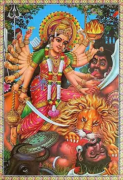 - And while Yudhishthira was on his way to the delightful city of Virata, he began to praise mentally the Divine Durga, the Supreme Goddess of the Universe, born on the womb of Yasoda, and fond of the boons bestowed on her by Narayana, sprung from the race of cowherd Nanda, and the giver of prosperity, the enhancer (of the glory) of (the worshipper's) family, the terrifier of Kansa, and the destroyer of Asuras,--and saluted the Goddess--her who ascended the skies when dashed (by Kansa) on a stony platform, who is the sister of Vasudeva, one who is always decked in celestial garlands and attired in celestial robes,--who is armed with scimitar and shield, and always rescues the worshipper sunk in sin, like a cow in the mire, who in the hours of distress calls upon that eternal giver of blessings for relieving him of their burdens.