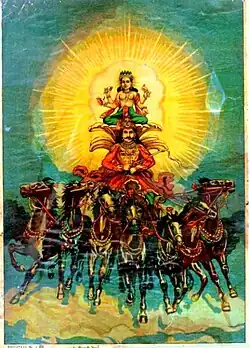- Vaisampayana said, 'Listen attentively, O king, purifying thyself and withdrawing thy mind from every other thing. And, O king of kings, appoint thou a time. I will tell thee everything in detail, And, O illustrious one, listen to the one hundred and eight names (of the sun) as they were disclosed of old by Dhaumya to the high-souled son of Pritha. Dhaumya said, 'Surya, Aryaman, Bhaga, Twastri, Pusha,Gabhastimat, Aja, Kala, Mrityu, Dhatri, Prabhakara, Prithibi, Apa, Teja, Kha, Vayu, the sole stay, Soma, Vrihaspati, Sukra, Budha, Angaraka, Indra, Vivaswat, Diptanshu, Suchi, Sauri, Sanaichara, Brahma, Vishnu, Rudra, Skanda, Vaisravana, Yama, Vaidyutagni, Jatharagni, Aindhna, Tejasampati, Dharmadhwaja, Veda-karttri, Vedanga, Vedavahana, Krita, Treta, Dwapara, Kali, full of every impurity, Kala, Kastha, Muhurtta, Kshapa, Yama, and Kshana; Samvatsara-kara, Aswattha, Kalachakra, Bibhavasu, Purusha, Saswata, Yogin, Vyaktavyakta, Sanatana, Kaladhyaksha, Prajadhyaksha, Viswakarma, Tamounda, Varuna, Sagara, Ansu, Jimuta, Jivana, Arihan, Bhutasraya, Bhutapati, Srastri, Samvartaka, Vanhi, Sarvadi, Alolupa, Ananta, Kapila, Bhanu, Kamada, Sarvatomukha, Jaya, Visala, Varada, Manas, Suparna, Bhutadi, Sighraga, Prandharana, Dhanwantari, Dhumaketu, Adideva, Aditisuta, Dwadasatman, Aravindaksha, Pitri, Matri, Pitamaha, Swarga-dwara, Prajadwara, Mokshadwara, Tripistapa, Dehakarti, Prasantatman, Viswatman, Viswatomukha, Characharatman, Sukhsmatman, the merciful Maitreya.