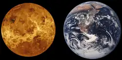 - Venus, unlike the Earth, has a hellish temperature. Venus is farther from the Sun than Mercury but is even hotter. The high temperature is due to an extreme greenhouse effect, the process by which the atmospheric gases raise the temperature by absorbing outward flowing heat. Earth’s atmosphere may once have contained large amounts of carbon dioxide, the way Venus’s atmosphere does now. But on earth, the oceans absorbed much of carbon dioxide, so that gas could not trap as much heat in the atmosphere as it does on Venus. ... Venus is earth’s “evil twin”. It’s about the same size as earth, but with deadly heat and pressure, an unbreathable atmosphere, and highly acid rain.