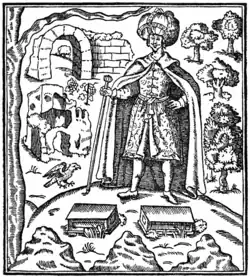 - And loe here is mine Effigie affixed with my Turkish habit, my walking staffe, & my Turban upon my head, even as I travelled in the bounds of Troy, and so through all Turkey: Before my face on the right hand standeth the Easterne and sole gate of that sometimes noble City, with a piece of a high wall, as yet undecayed: And without this Port runneth the River Simois (inclosing the old Grecian Campe) downe to the Marine, where it imbraceth the Sea Propontis: A little below, are bunches of grapes, denoting the vineyards of this fructiferous place; adjoyning neare to the fragments and ruynes of Priams Pallace, surnamed Ilium: And next to it a ravenous Eagle, for so this part of Phrigia is full of them: So beneath my feet ly the two Tombes of Priamus & Hecuba his Queene: And under them the incircling hills of Ida, at the West South west end of this once Regall Towne; & at my left hand, the delicious and pleasant fields of Olives and Figge-trees, wherewith the bowells of this famous soyle are interlarded.