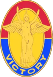 - An oval-shaped gold color metal and enamel device 1⅛ inches (2.86 cm) in height overall consisting of a gold color metal background encircled by an elliptical band divided horizontally of red to the top and blue to base, inscribed on the blue the motto “VICTORY” in gold color metal letters; centered on the device is the figure from the 1st Division Monument, modeled, in gold color metal, with wings and upraised arms extending over the red portion of the band.